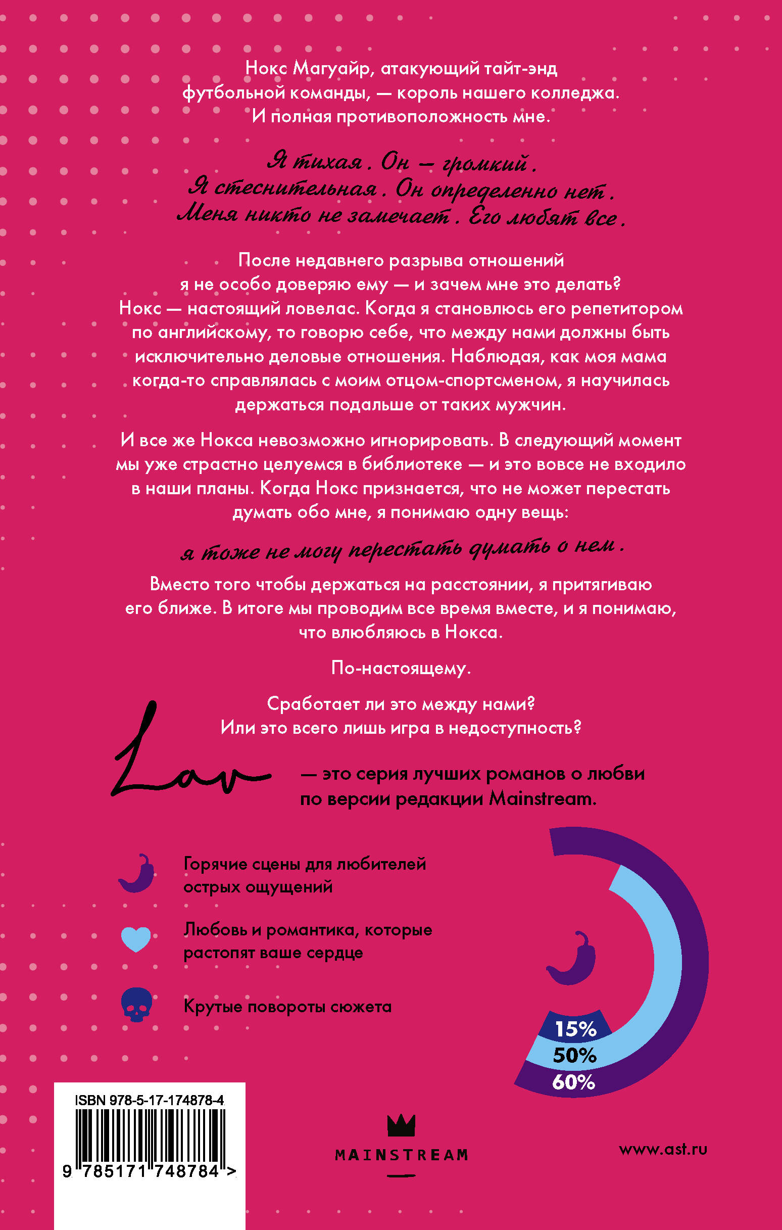 Нокс Магуайр, атакующий тайт-энд футбольной команды, - король нашего колледжа. И полная противоположность меня. Я тихая. Он - громкий. Я стеснительная. Он определенно нет. Меня никто не замечает. Его любят все. После недавнего разрыва отношений я не особо доверяю ему - и зачем мне это делать? Нокс - настоящий ловелас. Когда я становлюсь его репетитором по английскому, то говорю себе, что между нами должны быть исключительно деловые отношения. Наблюдая, как моя мама когда-то справлялась с моим отцом-спортсменом, я научилась держаться подальше от таких мужчин. И все же Нокса невозможно игнорировать. В следующий момент мы уже страстно целуемся в библиотеке - и это вовсе не входило в наши планы. Когда Нокс признается, что не может перестать думать обо мне, я понимаю одну вещь: Я тоже не могу перестать думать о нем. Вместо того чтобы держаться на расстоянии, я притягиваю его ближе. В итоге мы проводим все время вместе, и я понимаю, что влюбляюсь в Нокса. По-настоящему. Сработает ли это между нами? Или это всего лишь игра в недоступность?| Издательство | Издательство "АСТ" |