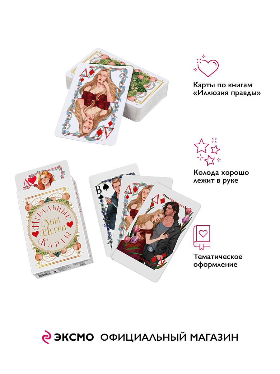 ИГРАЛЬНЫЕ КАРТЫ ПО МОТИВАМ СЕРИИ-БЕСТСЕЛЛЕРА АНЫ ШЕРРИ «ИЛЛЮЗИЯ ПРАВДЫ»! В КОМПЛЕКТ ВХОДЯТ 36 ИГРАЛЬНЫХ КАРТ И 3 ПОДАРОЧНЫХ КАРТЫ С ГЛАВНЫМИ ПАРАМИ ВСЕГО ЦИКЛА! Любовь - это не просто слово. Любовь - это физические проявления, это трепет, это момент неловкости, это румянец на щеках. «Иллюзия правды» - потрясающий цикл от мегапопулярного российского автора Аны Шерри. Хождение по лезвию бритвы, опасные связи, жгучая любовь, мафия и цыганские страсти - все это есть в книгах цикла «Иллюзия правды». Суммарные продажи книг Аны Шерри уже давно перевалили за отметку в 650 000 экземпляров. Ее истории стоят в одном ряду с другими звездами сентиментальной прозы, такими как Анна Джейн и Анна Тодд. Качественная бумага, оригинальный дизайн колоды от известного молодежного художника HerbstRegen. Удобно держать в руках, приятная на ощупь. Идеальный подарок любимому человеку!| Издательство | ООО "Издательство "Эксмо" |