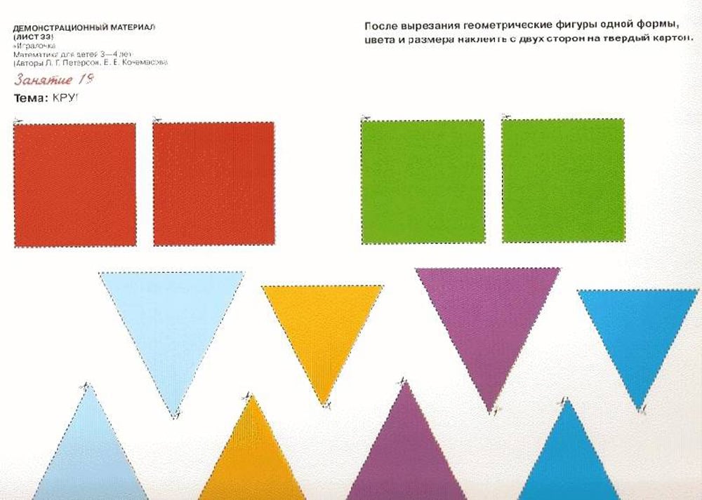 Перед вами демонстрационный материал, который является частью комплекта "Игралочка. Математика для детей 3 - 4 лет" авторов Л. Г. Петерсон и Е. Е. Кочемасовой. Комплект содержит: - Методические рекомендации для воспитателей и родителей по организации занятий с детьми - Тетрадь, которая представляет собой дополнительный материал для индивидуальной работы с детьми - Демонстрационный материал - Раздаточный материал, позволяющий обеспечить каждого ребенка, а также взрослого всем необходимым во время занятий. Раздаточный материал предназначен для использования одним ребенком и расположен на отдельных листах. Вверху каждого листа имеется номер и тема занятия, на котором данный материал используется. К раздаточному материалу прилагаются 16 конвертов и 1 лист с обозначением номеров листов и тм занятий. Для удобства пользования раздаточным материалом сначала следует наклеить на каждый конверт номер и тему занятия. После этого, начиная с первого занятия нужно по пунктирным линиям вырезать карточки, картинки, геометрические фигуры и складывать в соответствующие конверты. На разных занятиях возможно различное использование раздаточного и демонстрационного материала: в одних случаях необходим только раздаточный или только демонстрационный материал, в других - и тот и другой, в третьих - использование данных материалов не запланировано, т.к. дети на занятии пользуются игрушками, красками, соленым тестом и т.п. Номера и темы занятий в методических рекомендациях, тетрадях, а также на листах раздаточного и демонстрационного материала совпадают. Мы надеемся, что каждое занятие пройдет успешно и принесет удовлетворение вам, а вашим детям - радость и пользу!| Издательство | Просвещение |