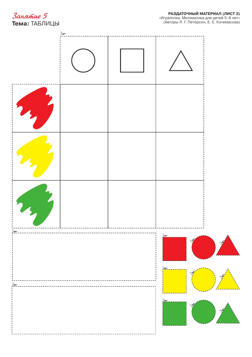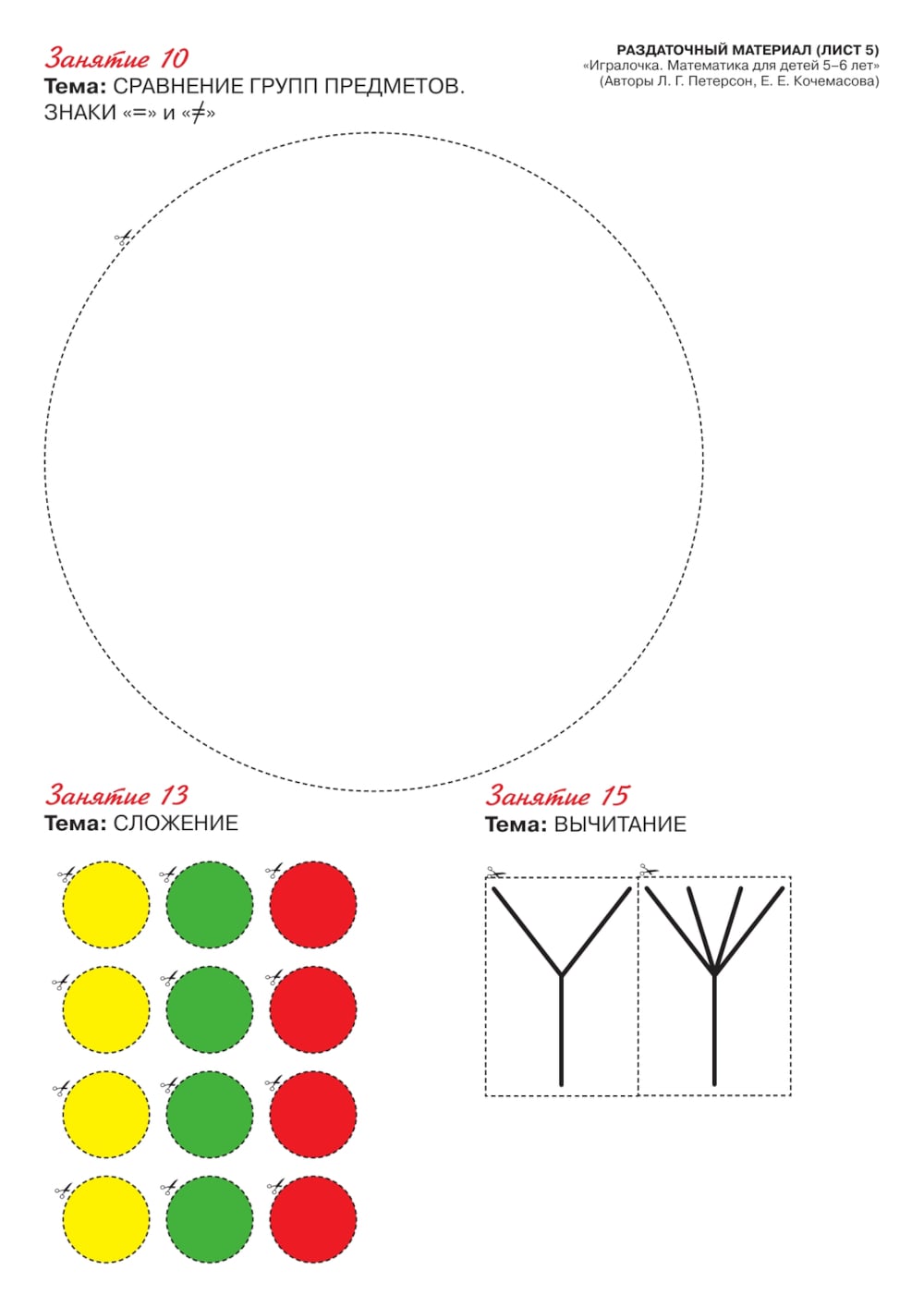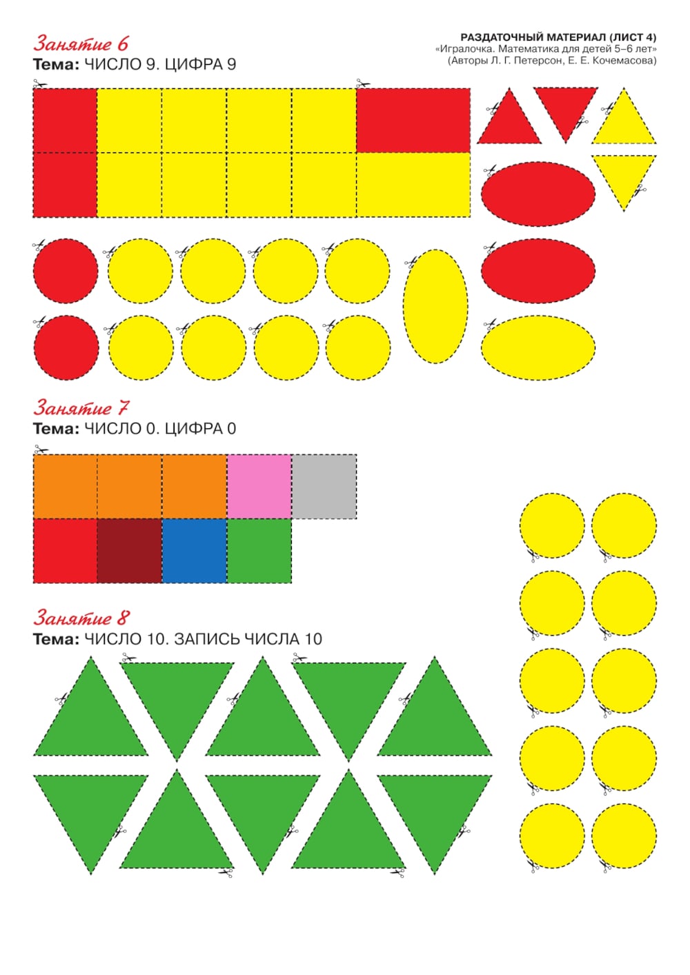 Раздаточный материал является частью комплекта «Игралочка» для детей 3-7 лет и предназначен для развития математических представлений детей 5-6 лет. Раздаточный материал расположен на отдельных листах. Вверху каждого листа даны номер и тема занятия, на котором данный материал используется. К раздаточному материалу прилагаются 6 конвертов и 1 лист с обозначением номеров листов и тем занятий. Для удобства пользования раздаточным материалом сначала следует наклеить на каждый конверт номер и тему занятия. Начиная с первого занятия, нужно по пунктирным линиям вырезать карточки, картинки, геометрические фигуры и складывать в соответствующие конверты. Раздаточный материал рассчитан на использование его одним ребёнком. Раздаточный материал поможет развить у дошкольников мышление, творческие способности, интерес к математике.