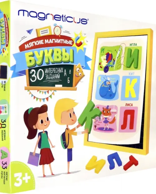 Состав набора: 33 мягкие магнитные буквы русского алфавита, 30 игровых заданий, металлическое игровое поле, встроенное в коробку для хранения мозаики.