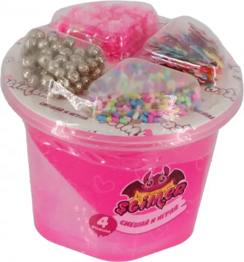 В набор Slimer Смешай и играй входят: розовый полупрозрачный слайм, пенопластовые шарики, блестки, голографические фигурки, посыпка.