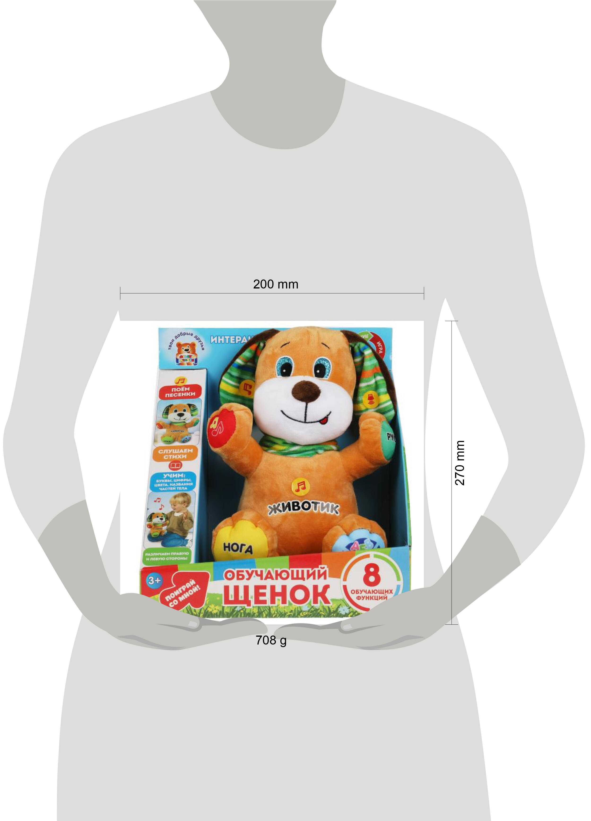 Интерактивная мягкая игрушка "Щенок" ТМ "Мульти-Пульти" станет прекрасным подарком для ребёнка: - запоминаем названия частей тела - учимся считать - учим буквы - учим цвета - различаем правую и левую стороны - слушаем стихи и песни - играем в весёлую игру "Покажи!" - регулировка громкости Малыш будет в восторге от этого очаровательного и очень мягкого щенка, которого так приятно обнимать. У игрушки милая мордочка с вышитыми глазками и длинные ушки из разноцветного материала. Щенок выполняет несколько обучающих функций, он станет для ребёнка хорошим учителем и добрым другом, который расскажет интересные стихи, споёт песенки, поможет выучить буквы, цифры и цвета. Игра с интерактивной мягкой игрушкой ТМ "Мульти-Пульти" развивает: - воображение и фантазию - слуховое и тактильное восприятие - музыкальный слух - социально-коммуникативные навыки - мелкую моторику Размер: 27 см. Материал: текстиль + пластмасса + металл. Работает от 3-х батареек типа ААА (в комплекте). Рекомендовано детям от 3-х лет.