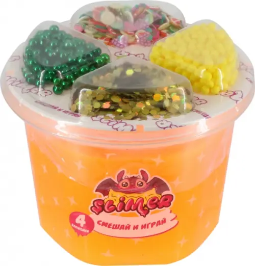 В набор Slimer Смешай и играй входят: красочный полупрозрачный слайм, пенопластовые шарики, блестки, голографические фигурки, посыпка. Вложения придадут слайму красивый блеск и неповторимый вид при его растягивании. Слайм приятно похрустывает, кликает.