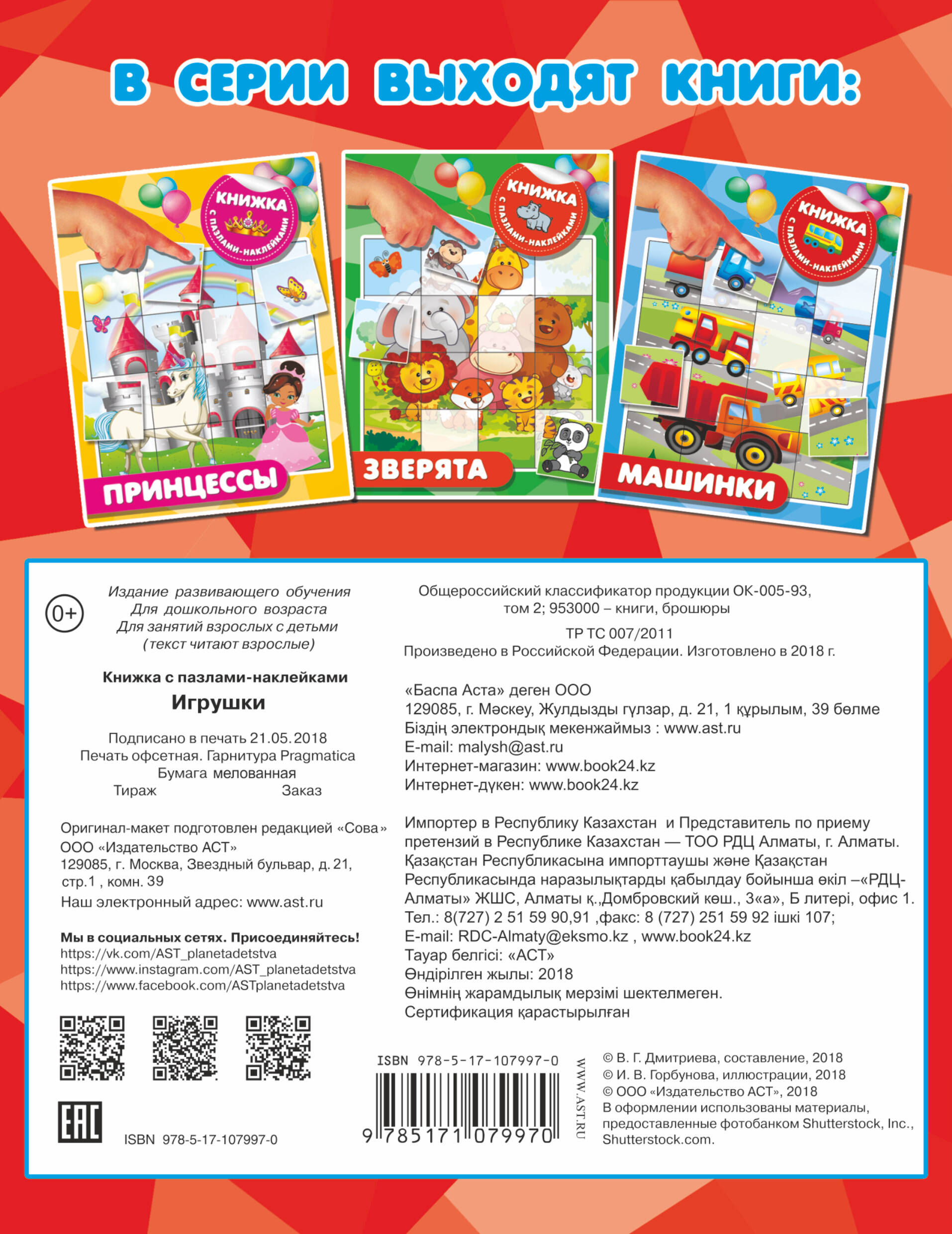 О чем эта книга Прекрасно иллюстрированная книжка-игра с весёлыми загадками об игрушках + 80 красочных многоразовых наклеек. Кому эта книга будет интересна Отличный подарок для дошколят - занимательная, полезная игра + 80 красочных стикеров, которые можно наклеивать на страницы книги много-много раз. Каковы особенности этой книги • С нашей книжкой ребенок в легкой, увлекательной форме научится разгадывать загадки. • На каждой странице книги - загадка и картинка-отгадка, которую ребёнок по образцу сложит из пазлов-наклеек. • Малышу очень интересно искать нужные наклейки, правильно подбирать фрагменты картинок. • Отгадывание загадок и поиск наклеек сделают игровые занятия увлекательными и полезными: помогут ребёнку тренировать пальчики, разовьют речь, внимание, память, мышление и фантазию. Играть с пазлами-наклейками и отгадывать весёлые загадки - здорово, весело и увлекательно!