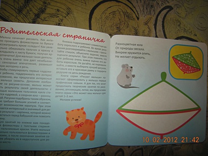 Малыш начинает рисовать. Как интересно проводить фломастером по бумаге и рассматривать яркие "следы"! Как увлекательно обмакивать пальчик в краску и прикладывать к листу бумаги, получая яркие отпечатки! Для малыша такая деятельность очень важна: она дает незабываемые сенсорные впечатления, развивает мелкую моторику и речь.Чтобы стимулировать первые "художества" ребенка, поддерживать его интерес к рисованию, мы предлагаем интересные для малыша сюжеты. Дополняя изображение на рисунке-основе, малыш может видеть результаты своей деятельности: с помощью маленьких пальчиков кукла становится кудрявой, а озорная юла - разноцветной. Рисунки подобраны таким образом, что не требуют больших усилий и соответствуют возможностям карапуза. При этом получается интересный и значимый для ребенка результат - картинка, которой можно похвастаться перед бабушкой или повесить на стену.