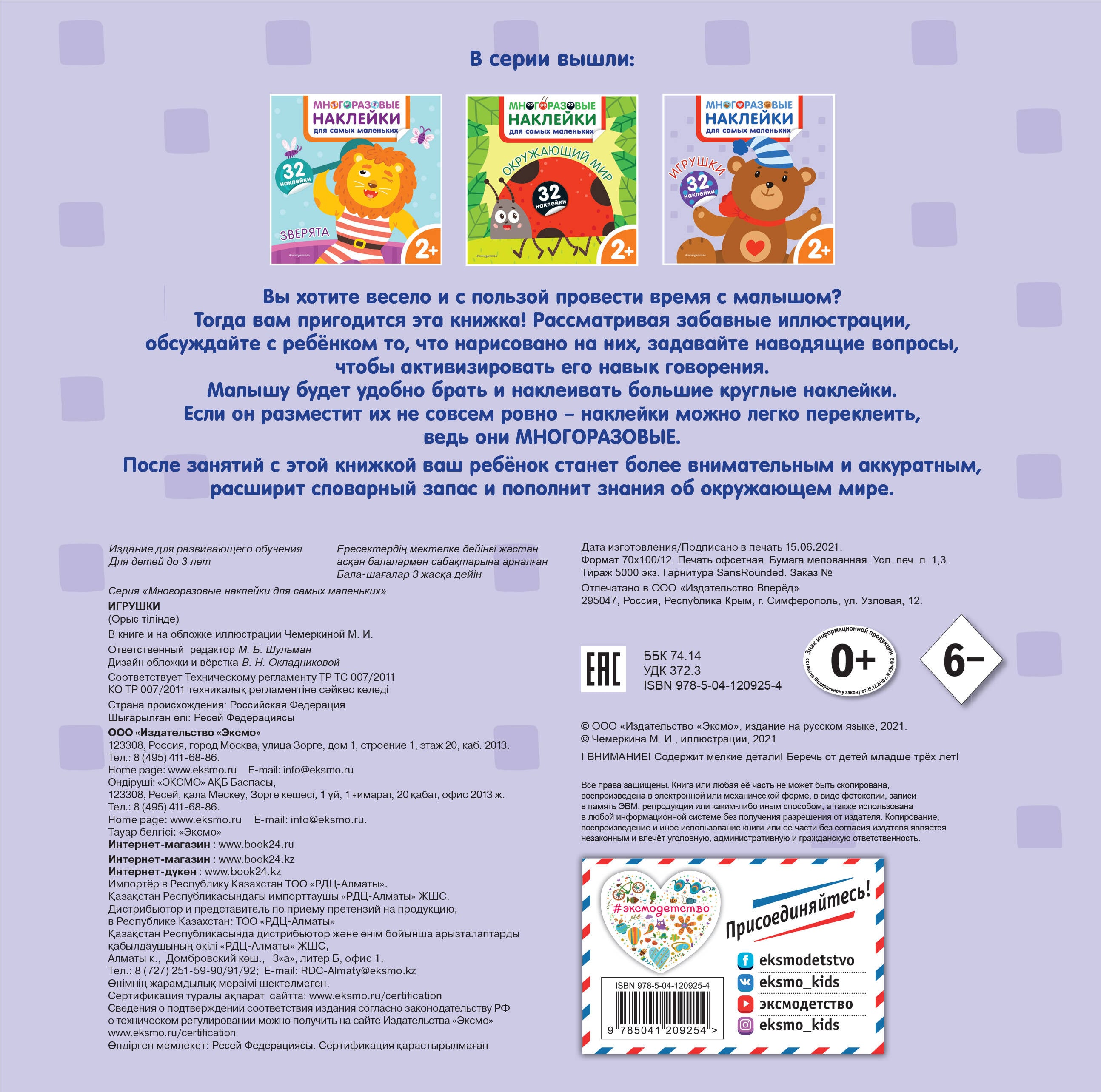 Серия «Многоразовые наклейки для самых маленьких» специально разработана для малышей: небольшой квадратный размер, крупные круглые наклейки, яркие иллюстрации. С одной стороны, играя с книгой, малыш весело проведёт время, ведь он будет «оживлять» картинки с помощью наклеек. С другой - одновременно разовьёт внимание, мышление и воображение, ведь соответствующую наклейку ещё нужно найти! А отвечая на вопросы к картинкам, он попрактикуется в разговорной речи и расширит словарный запас.| Издательство | ООО "Издательство "Эксмо" |