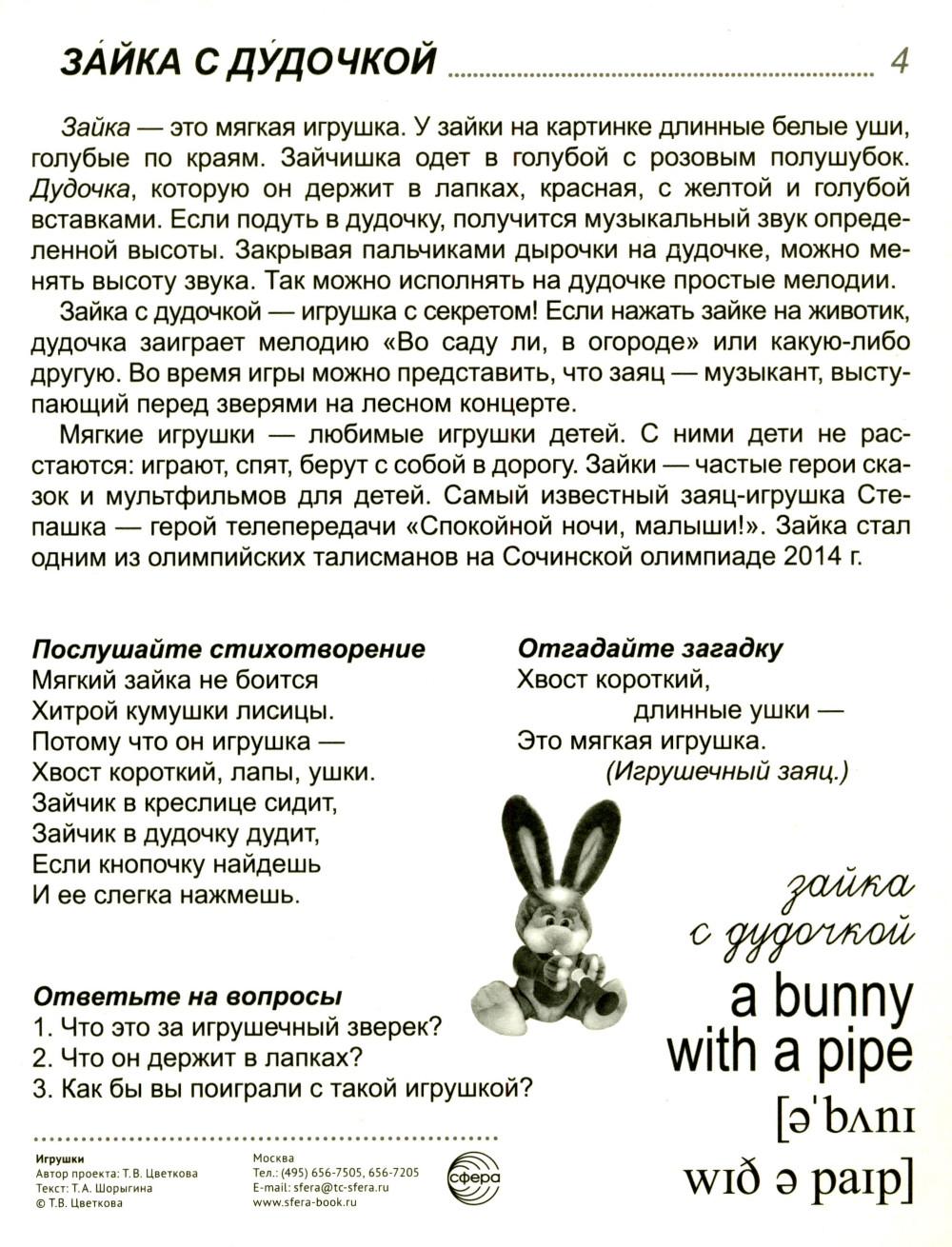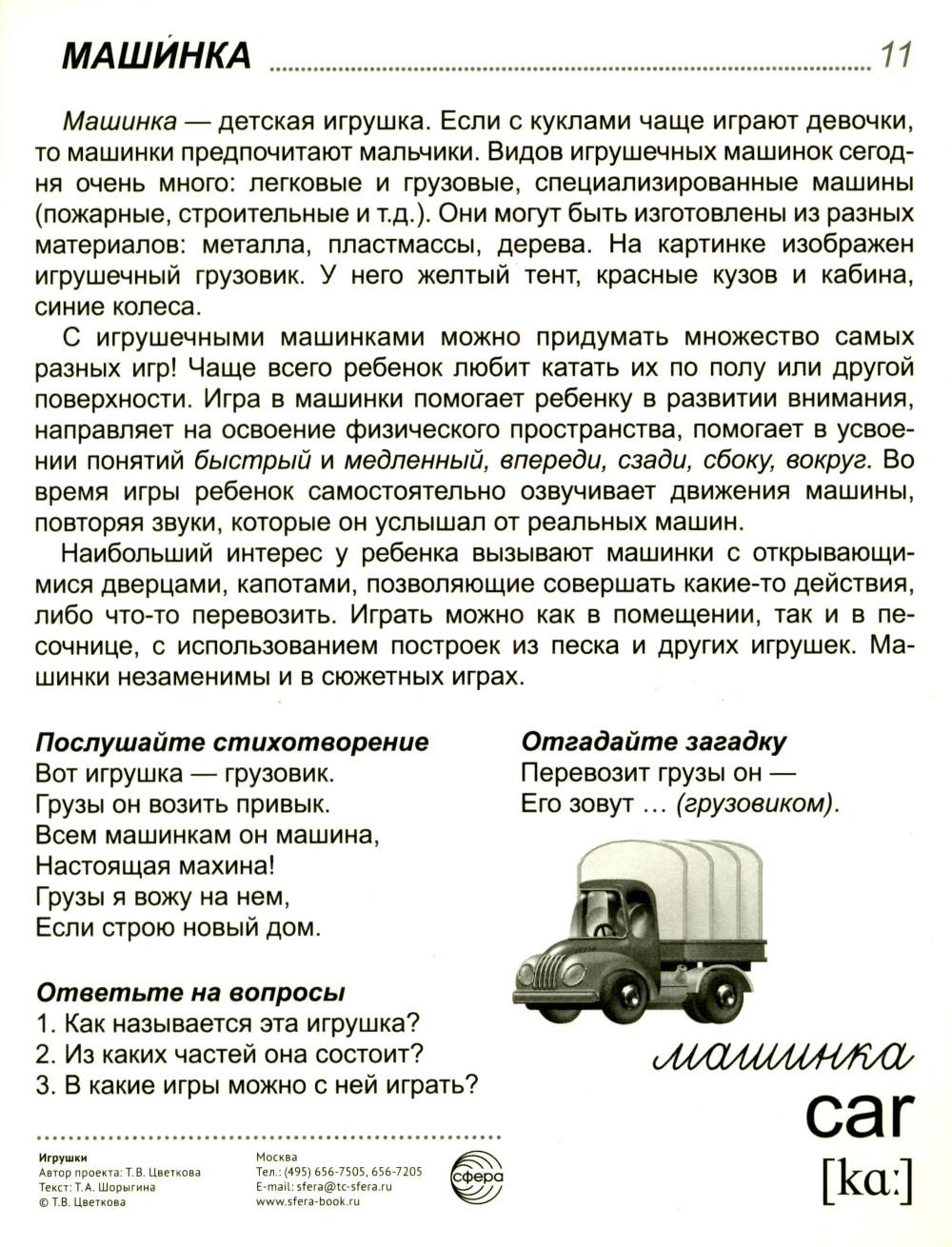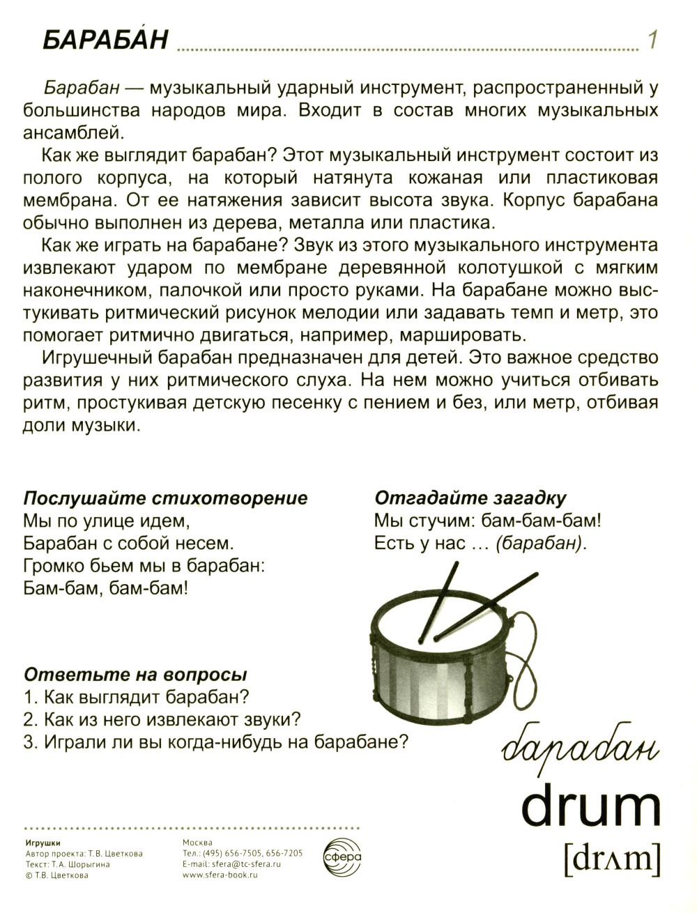 16 демонстрационных картинок размером 173х220 мм для познавательного и речевого развития. На обороте каждой предметной картинки - описание, стихотворение, загадка, вопросы для ребёнка, название на русском и английском языках. Состав комплекта: Музыкальные инструменты и музыканты: барабан, бубен, зайка с дудочкой, мишка с барабаном. Предметы для песочницы: ведерко, лопатка, лейка. Строительство: кубики, пирамидка. Для подвижных игр: мячик. Остальные игрушки: кукла, лошадка, матрёшка, машина, неваляшка, флажок.| Издательство | Творческий центр Сфера |