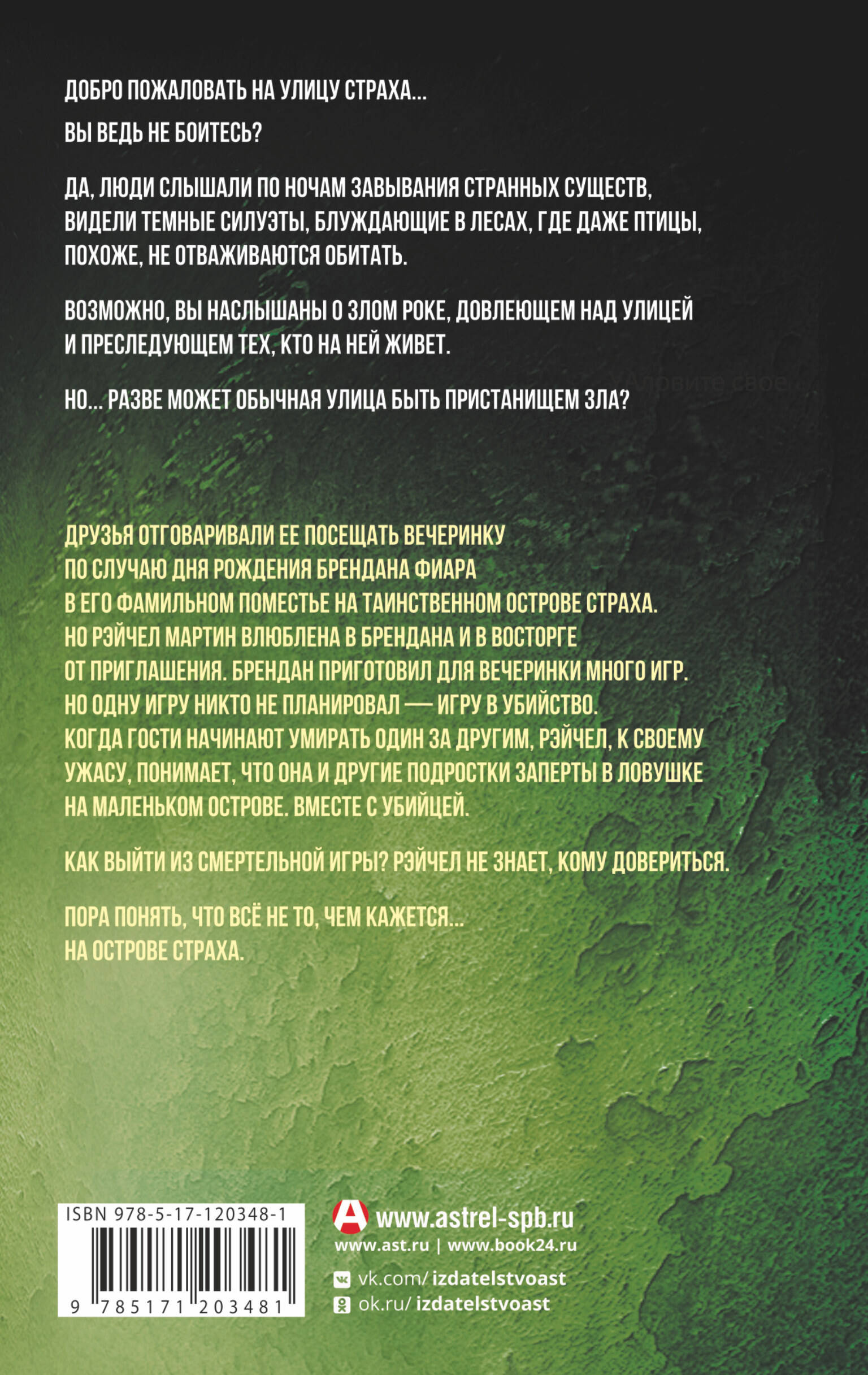 Добро пожаловать на улицу Страха... Друзья отговаривали ее посещать вечеринку по случаю дня рождения Брендана Фиара в его фамильном поместье на таинственном острове Страха. Но Рэйчел Мартин влюблена в Брендана и в восторге от приглашения. Брендан приготовил для вечеринки много игр. Но одну игру никто не планировал - игру в убийство. Когда гости начинают умирать один за другим, Рэйчел, к своему ужасу, понимает, что она и другие подростки заперты в ловушке на маленьком острове. Вместе с убийцей. Как выйти из смертельной игры? Рэйчел не знает, ко му довериться. Пора понять, что всё не то, чем кажется... на острове Страха.| Издательство | ИЗДАТЕЛЬСТВО "АСТ" |
