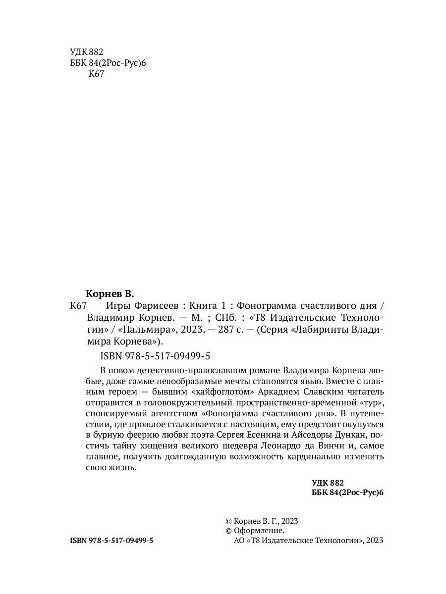 В новом детективно-православном романе Владимира Корнева любые, даже самые невообразимые мечты становятся явью. Вместе с главным героем - бывшим «кайфоглотом» Аркадием Славским читатель отправится в головокружительный пространственно-временной «тур», спонсируемый агентством «Фонограмма счастливого дня». В путешествии, где прошлое сталкивается с настоящим, ему предстоит окунуться в бурную феерию любви поэта Сергея Есенина и Айседоры Дункан, постичь тайну хищения великого шедевра Леонардо да Винчи и, самое главное, получить долгожданную возможность кардинально изменить свою жизнь.| Издательство | Т8 RUGRAM |