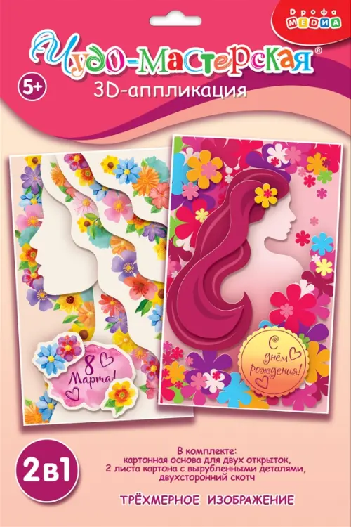 3D-аппликация - современный и очень увлекательный вид творчества. Малыш легко сделает самостоятельно объёмные 3D-открытки: детали аппликации уже вырублены, нужно только аккуратно выдавить их из основы и приклеить на картинку объёмным двухсторонним скотчем. Элементы аппликации наклеиваются в несколько слоёв, что придаёт плоскому изображению эффект объёма.