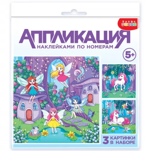 Аппликация наклейками по номерам - это увлекательный набор для детского творчества. В комплекте есть всё необходимое: 3 картинки-основы с изображениями волшебного мира и 3 листа с наклейками.
