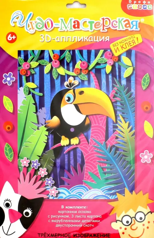 3D-аппликация - современный и очень увлекательный вид творчества. Данный набор позволит создать необыкновенно выразительную 3D-картину. Яркие и красочные детали изображения, выполненные из плотного картона, выступают над основой, создавая причудливый и сказочный мир. Этот удивительный 3D-эффект возникает благодаря использованию объёмного двустороннего скотча. Готовое изделие смотрится необыкновенно эффектно.