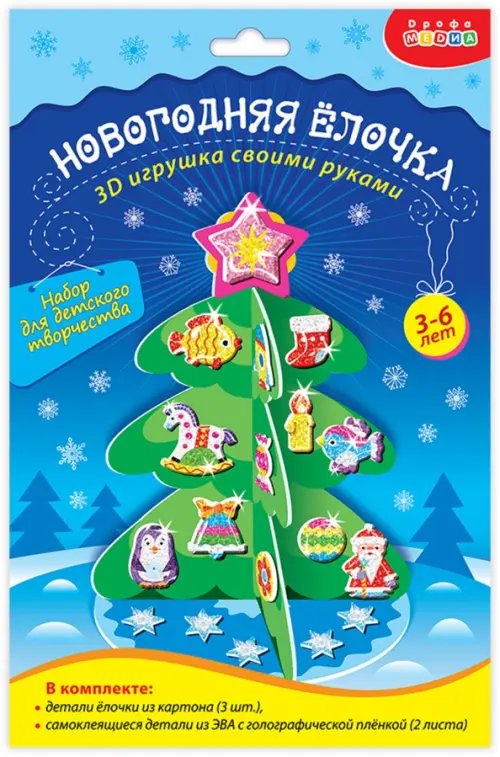 В комплекте: детали ёлочки из картона (3 шт.), самоклеящиеся детали из ЭВА с голографической пленкой (2 листа).