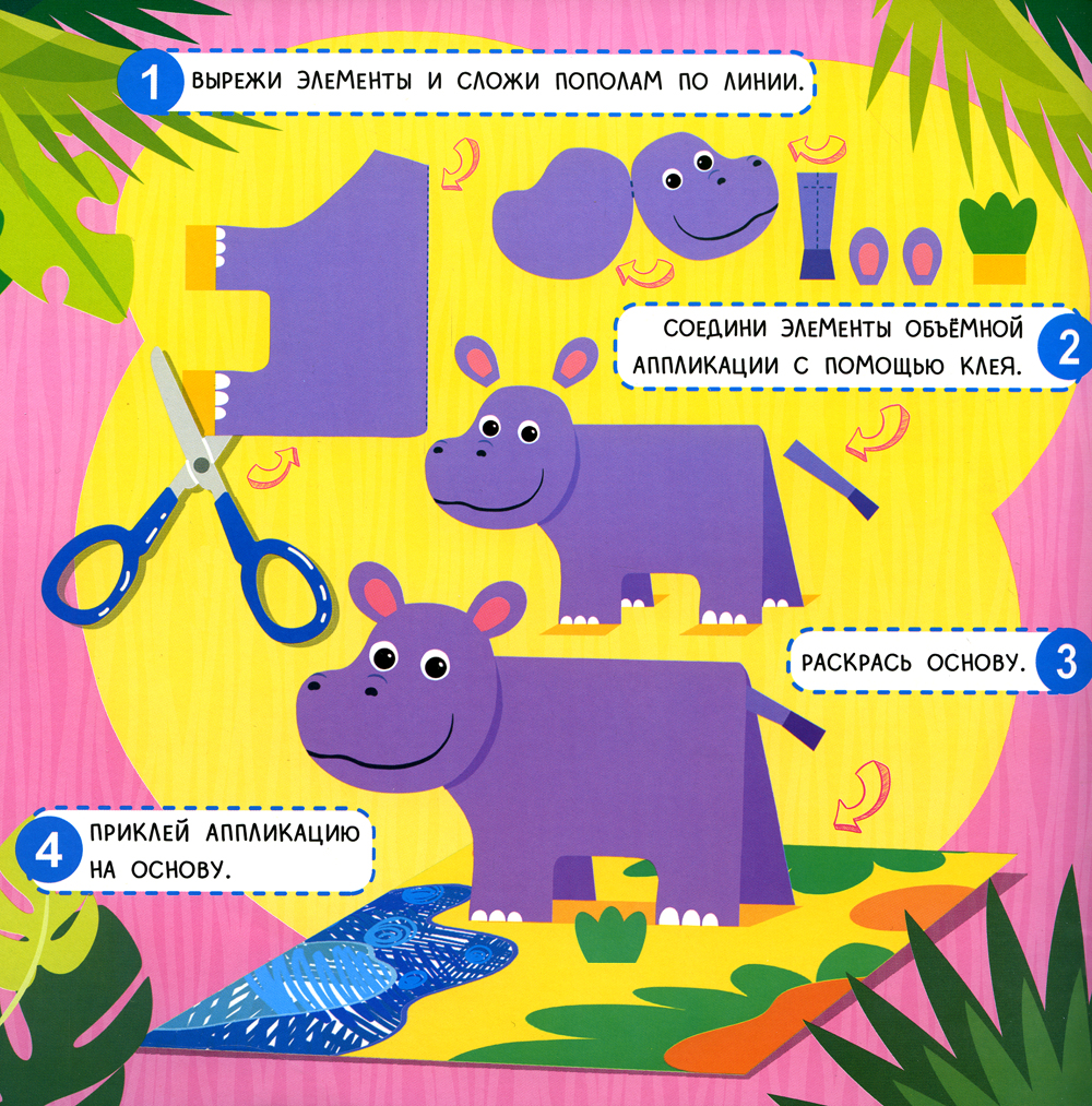 Рабочая тетрадь для творчества с элементами для вырезания и раскрашивания. Внутри этой книжки-вырезалки вы найдёте подробную схему по сборке объёмных аппликаций, развёртки с персонажами и фоны с элементами для раскрашивания к ним, а также развивающие задания на логику и внимательность. Детали развёртки с персонажем необходимо вырезать, собрать по образцу, склеить между собой и закрепить на фоне с помощью клея-карандаша. Цветные контуры фона-раскраски помогут малышу сориентироваться в выборе нужного карандаша для раскрашивания. Вырезая детали, собирая и наклеивая их на лист, ребёнок получит уникальную объёмную аппликацию на красочном фоне, созданную своими руками.| Издательство | Феникс |