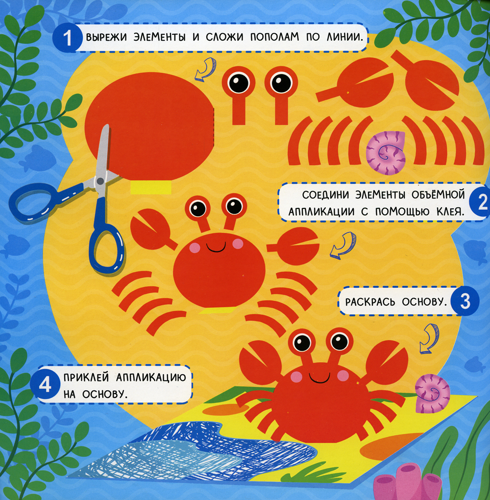 Рабочая тетрадь для творчества с элементами для вырезания и раскрашивания. Внутри этой книжки-вырезалки вы найдёте подробную схему по сборке объёмных аппликаций, развёртки с персонажами и фоны с элементами для раскрашивания к ним, а также развивающие задания на логику и внимательность. Детали развёртки с персонажем необходимо вырезать, собрать по образцу, склеить между собой и закрепить на фоне с помощью клея-карандаша. Цветные контуры фона-раскраски помогут малышу сориентироваться в выборе нужного карандаша для раскрашивания. Вырезая детали, собирая и наклеивая их на лист, ребёнок получит уникальную объёмную аппликацию на красочном фоне, созданную своими руками.| Издательство | Феникс |