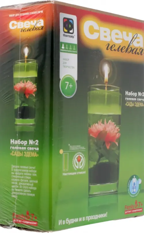 Состав набора: тюбик геля, стеклянный стакан, фитиль, цветной песок, декоративный цветок.