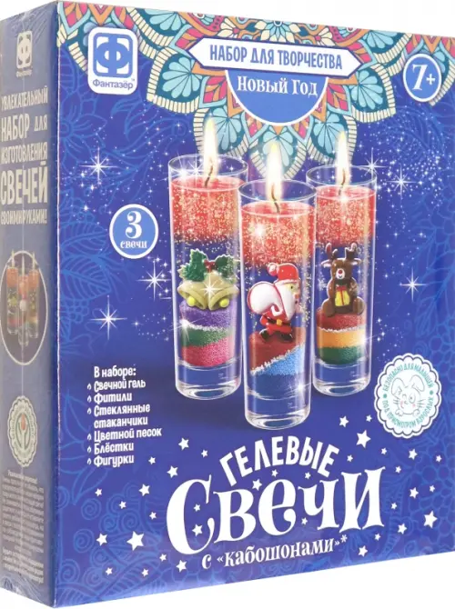 В наборе: 3 стеклянных стаканчика, цветной песок, блёстки, 3 фигурки, гель прозрачный и цветной, 3 фитиля, ложка и инструкция.