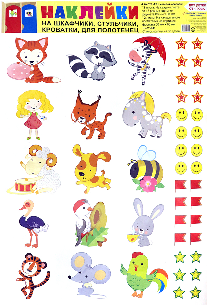 Аннотация: Наклейки на шкафчики, кроватки и стульчики и поощрения (от 1 года)