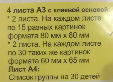 В комплекте 90 наклеек, рассчитанных на 30 детей, по 3 наклейки на каждого ребенка. В дополнение к комплекту вложены лист А4 со списком для группы с изображениями тех же рисунков и маленькие наклейки для поощрения детей.
