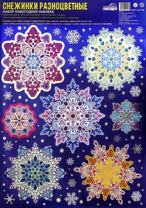 Чудесные украшения помогут сделать любой интерьер интересным, создать уют и праздничную зимнюю атмосферу. Они несомненно порадуют и детей и взрослых. Многоразовые наклейки легко приклеиваются и снимаются, не оставляя следов на любых гладких поверхностях - окнах, зеркалах, пластике, кафельной плитке и др.