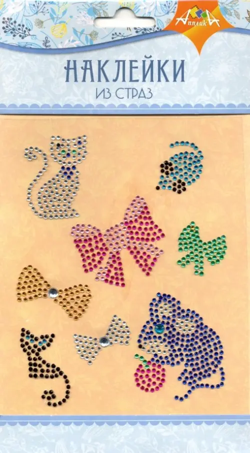 Набор для творчества. Декоративные наклейки из страз. Из цветных страз собраны фигурки, имеющие клеевой слой. В каждом наборе фигурки определенной тематики, а также небольшие декоративные элементы. В ассортименте представлены: "Мишки", "Звездочки", Бабочки", "Кошечки", "Сердечки". Фигурки легко отделяются от подложки и могут быть приклеены на гладкую ровную поверхность. Упаковка - ПЭТ пакет с картонным вкладышем и европодвесом.