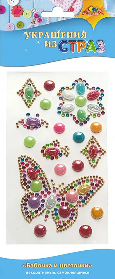 В каждом наборе фигурки определенной цветовой гаммы. Фигурки легко отделяются от подложки и могут быть приклеены на гладкую ровную поверхность. В качестве декора можно использовать и отдельные стразы.