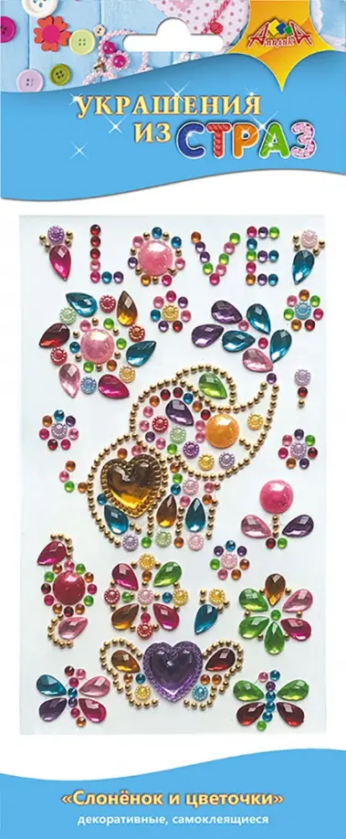 В каждом наборе фигурки определенной цветовой гаммы. Фигурки легко отделяются от подложки и могут быть приклеены на гладкую ровную поверхность. В качестве декора можно использовать и отдельные стразы.
