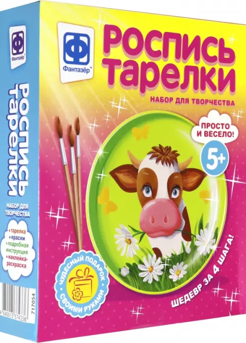 В наборе: пластиковая тарелка, краски, кисть, наклейка-раскраска, инструкция.