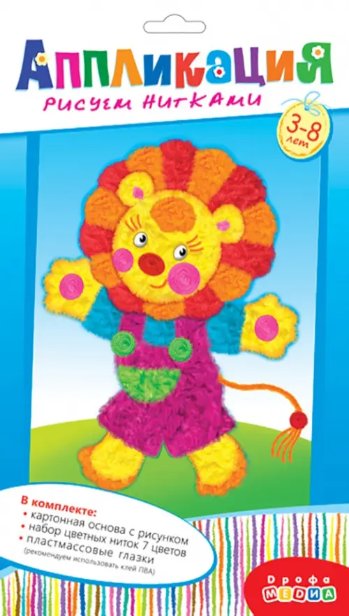 В наборе: цветная основа с рисунком, акриловые нитки (7 цветов), декоративные элементы на самоклеящейся основе (глазки), цветная листовка-образец.