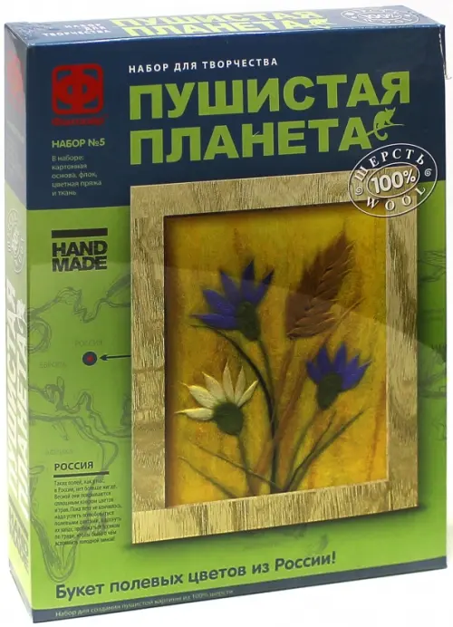 В набор входит: пластиковая картонная основа, флок, цветная пряжа и ткань.