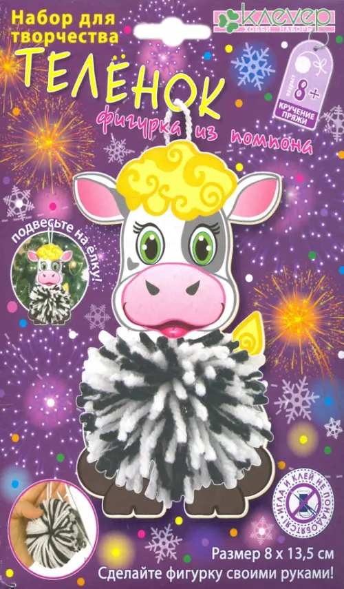 Комплектация: цветная гипоаллергенная пряжа, цветной картон с деталями и шаблонами, тонкая двусторонняя клейкая лента, пошаговая инструкция Телёнок из помпона станет игрушкой или украшением на ёлке, подарит хорошее настроение! Детям старше 8-ми лет будет нетрудно сделать такую игрушку: ребёнок научится делать помпон, вырезать детали и склеивать с помощью двустороннего скотча детали и помпон.