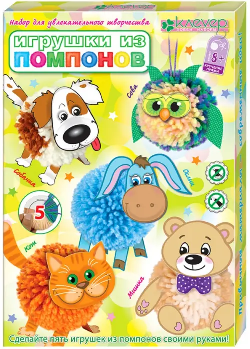 Состав набора: пряжа, картонные детали и шаблоны для кручения помпонов, скотч, инструкция.