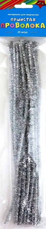 Пушистая проволока блестящая (часто называется Синельной проволокой или Синелью). В металлическую проволоку вплетены волоски из фольги. Длина проволоки - 30 см. В наборе 50 штук 5 цветов: золотой, серебряный, красный, зеленый , синий. Диаметр 7 мм. Проволока отлично гнется, держит форму и режется ножницами, что позволяет создавать из неё различные игрушки и поделки. Пушистый ворс приятен на ощупь, однако не забывайте, что в основе металлическая проволока, будьте осторожны, чтобы не поцарапаться. Упаковка - ПЭТ-пакет с европодвесом. Набор предназначен для детей от 3-х лет.