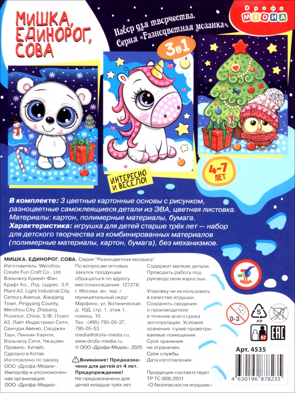 - 3 картонные основы с мишкой, единорогом и маленьким совёнком;