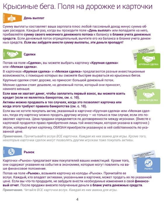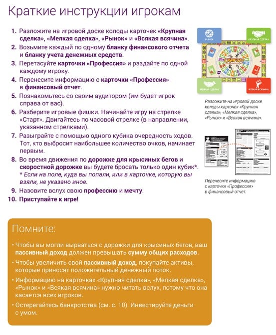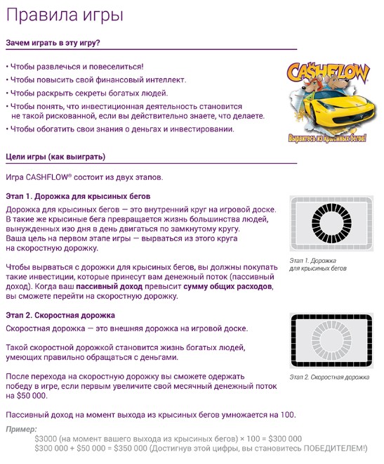 Распрощайтесь с крысиными бегами раз и навсегда, начав играть в "CASHFLOW"! Вы сможете приобретать недвижимость, акции, бизнесы, драгоценные металлы и многое другое. Вы будете играть не только друг против друга, но также против рынка недвижимости, против фондовой биржи и даже против самой матушки-природы. Новая игра "CASHFLOW" стала более быстрой, прогрессивной и интерактивной, тем самым отвечая потребностям современного общества. Каждая карточка теперь может запросто изменить весь ход игры, а каждая сделка сулит максимум возможностей. Новый дизайн, новые условия, новые фишки, новые карточки! Играя в "CASHFLOW", вы получаете шанс развивать и тестировать стратегии, на которые никогда бы не решились в реальной жизни. Станьте бунтарем - инвестируйте во что-нибудь по-настоящему безумное! Если в обычной жизни вы экономный человек, то в игре попробуйте агрессивное инвестирование. Если по жизни вы азартный игрок, то как насчет долгосрочных активов? Победа - это великолепно, но возможность испытать разные финансовые сценарии в игровой форме - еще лучше!
