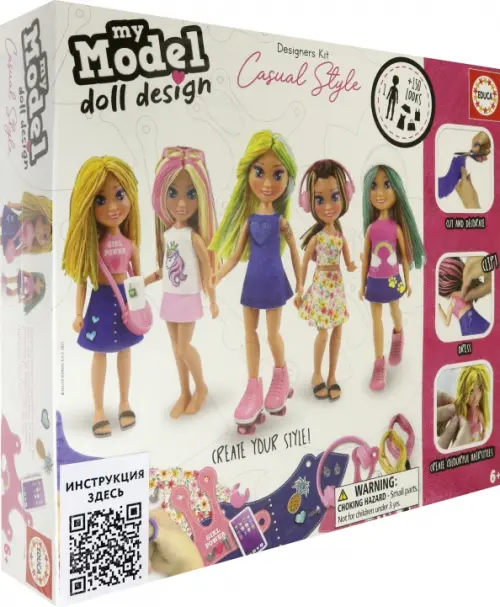 В комплекте: шарнирная кукла, ткань с распечатанными выкройками, 23 модных аксессуара, 26 наклеек, зажимы для одежды, 8 цветных мотков шерсти для волос, дырокол, инструкция.