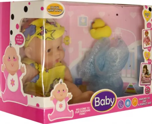 В наборе пупс с аксессуарами: мочалка, уточка.