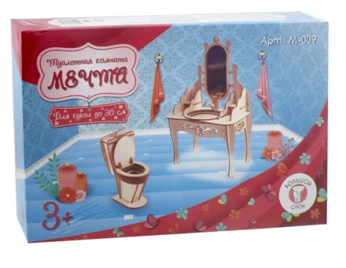 Сборная мебель для кукол "Туалетная комната" порадует девочек возможностью дополнить кукольное жилище еще одной комнатой. Ребенок будет увлечен сборкой игрушечных унитаза и раковины с зеркалом, а потом будет воссоздавать игры в дом и семью.