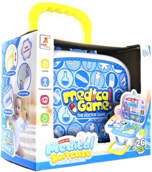 Комплектация: инструменты доктора 9 предметов, элементы чемодана 8 предметов, тюбик, лампа, очки короб, фонендоскоп, элементы капельницы 4.