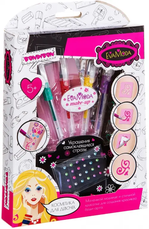 Набор аксессуаров для создания красивого боди-арта маленькой моднице и стильной красотке! Осталось применить творческий подход и создать свой неповторимый образ! Вся продукция гипоаллергенна и безопасна для детей, легко смывается с кожи водой.