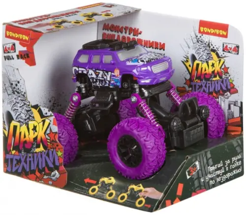 С такой машинкой можно будет играть на любой поверхности, а её небольшой размер позволяет носить её везде с собой. Передняя и задняя подвеска подпружинены. Шарнирное соединение позволяет наклоняться влево и вправо (передняя и задняя подвеска с отдельными шарнирами). Корпус сменный. Принт на фиолетовом корпусе машины.