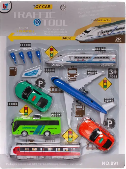 Состав набора: 2 поезда, 2 легковые машины, междугородний автобус, самолет.