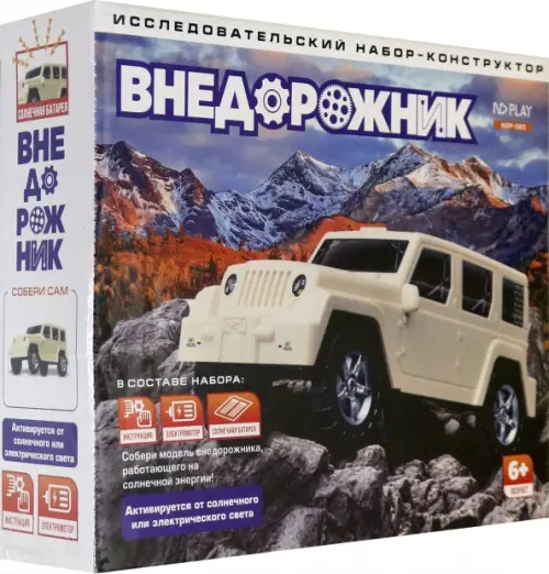 Конструктор "Внедорожник" - это набор для самостоятельной сборки, позволяющий собрать модель классического рамного внедорожника. Сборка управляемых электромеханических систем помогает ребенку развивать мышление и знакомит с технологией роботостроения. Конструктор работает от солнечного света под действием прямых солнечных лучей в солнечный день или от прямого электрического света лампы накаливания мощностью 75 Вт и выше или галогенной лампы аналогичной мощности.