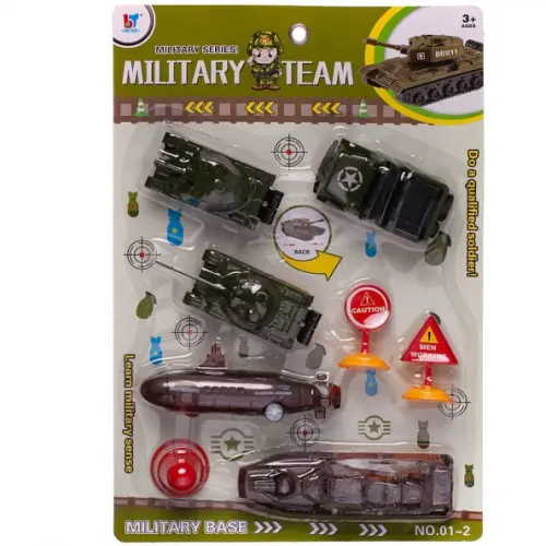 Состав набора: танк - 2 шт., военный джип - 1 шт., морской крейсер - 1 шт., подводная лодка - 1 шт., дорожные знаки - 3 шт.