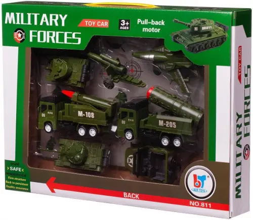 Состав набора: танк - 2 шт., военный джип - 1 шт., ракетная установка - 2 шт., самолет-истребитель - 1 шт., пушка - 1шт.