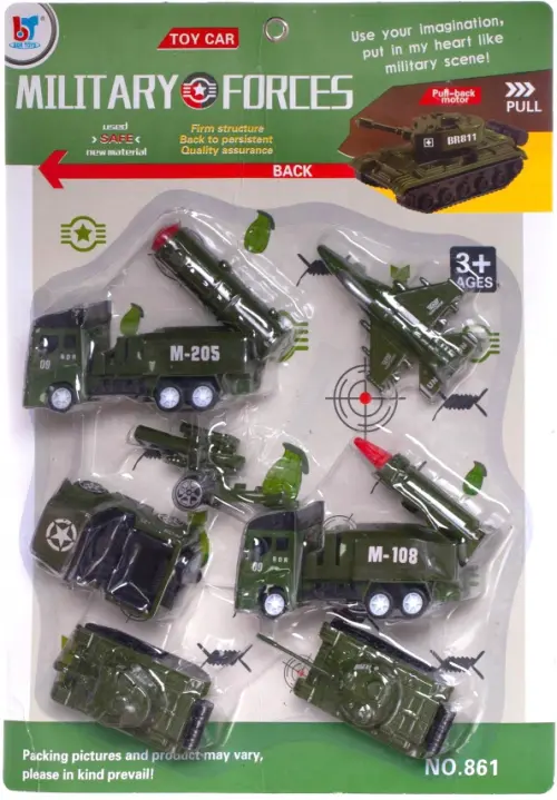 Этот игровой набор сможет понравиться тем мальчишкам, которые любят военные игры и фильмы. В состав набора «Боевая сила» от бренда Junfa входят две ракетные установки, два танка, военный джип с прицепом, истребитель. Вся техника изготовлена из пластмассы, выполнена в традиционных цветах, некоторые единицы имеют подвижные детали и съемные элементы, оснащены инерционным механизмом. Если оттянуть машинку назад, а затем отпустить, она поедет вперед.