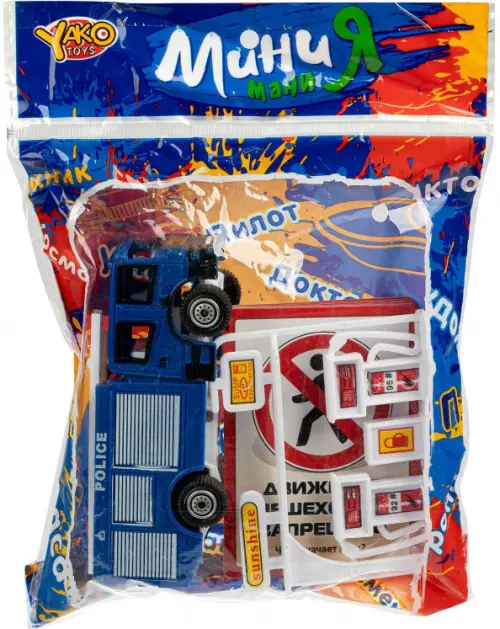 В набор входит машинка инерционная (pull back), заправка и 6 карточек на знание дорожных знаков для "сдачи экзамена по теории". На фронтальной стороне карточки - изображение дорожного знака, на оборотной стороне карточки - ответ.