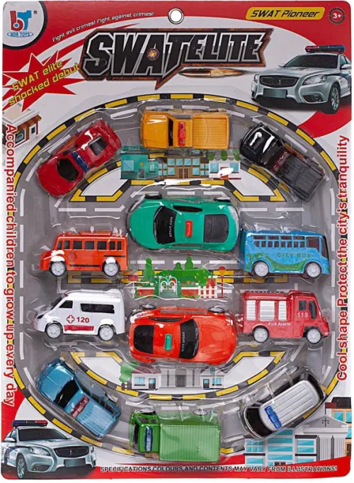 Все мальчишки любят играть с машинками. Этот замечательный набор состоит из 12 машинок различных городских служб. В нем есть полицейская и пожарная машинки, скорая помощь, мусоровоз, автобус и другие. Они выполнены в ярких цветах. Модели сделаны из пластмассы и оснащены инерционным механизмом. Если оттянуть машинку назад, а затем отпустить, она поедет вперед.
