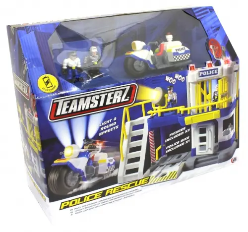 Полиция Teamsterz на страже города. Плохой парень пойман и заперт в камере в полицейском участке. Если он попытается сбежать и откроет двери камеры, сработает сирена и световая сигнализация, а прожектор осветит окрестности. Мощный полицейский мотоцикл всегда поможет догнать преступника.